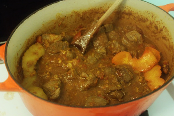 7. Give the lamb pieces a good stir to coat them in the curry mixture, cover the pot, and put it in the oven. Cook the lamb 1 1/2 hours, stirring now and then.