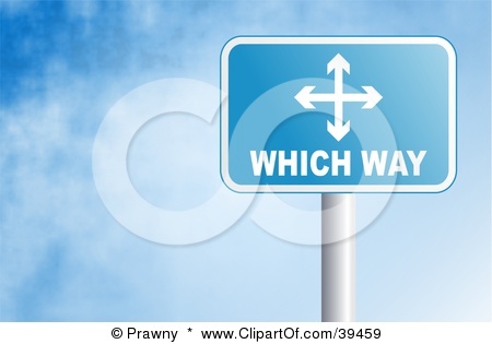 39459-Clipart-Illustration-Of-A-Blue-Rectangular-Which-Way-Sign-Against-A-Blue-Sky-With-Clouds