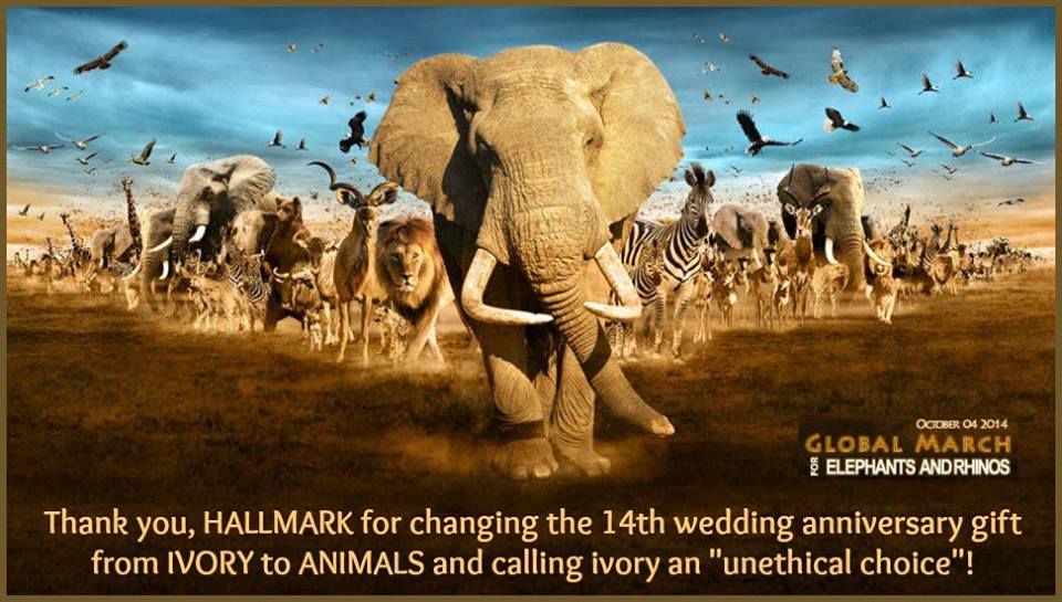 Hi everyone, this is an update on Hallmark who had listed ivory as the 14th wedding anniversary gift idea (from elephants who shed tusks). Many advocates emailed them and posted on their Facebook wall and they have done the following. THANK YOU TO Hallmark for responding to elephant advocates’ outrage and CHANGING their theme for a 14th wedding anniversary from Ivory to Animals, with ethical choices for gifts including an eco-tour or donation to a wildlife organization! Thanks to all of YOU who responded to our August 3rd call to action – you did it! We appreciate Hallmark’s response to our concerns that they were promoting the sale of ivory, and over their misinformation that ivory jewelry is often made from ivory “shed naturally from animals”. Here is the new text on their website: